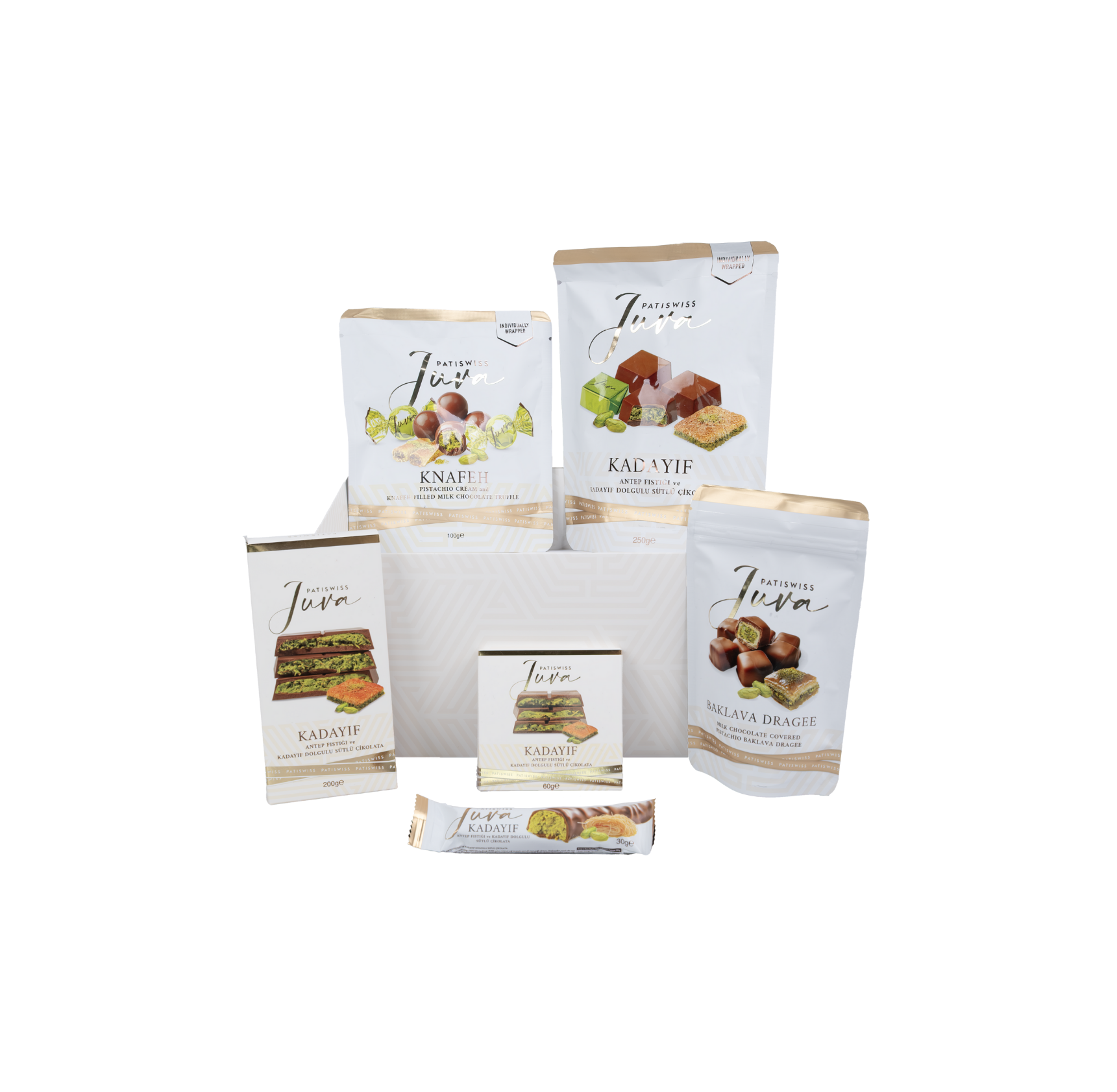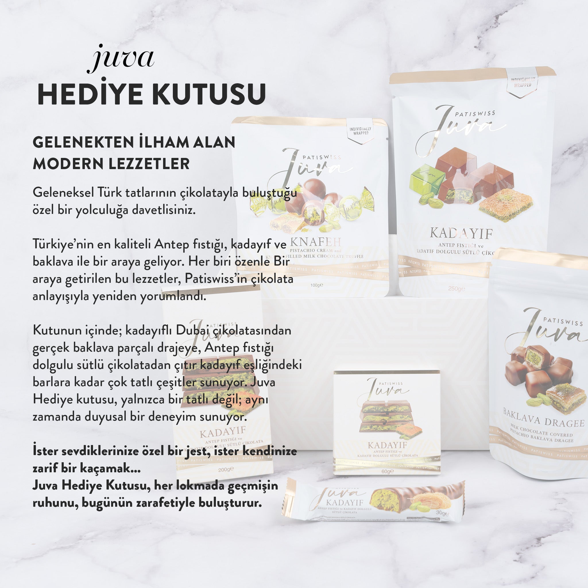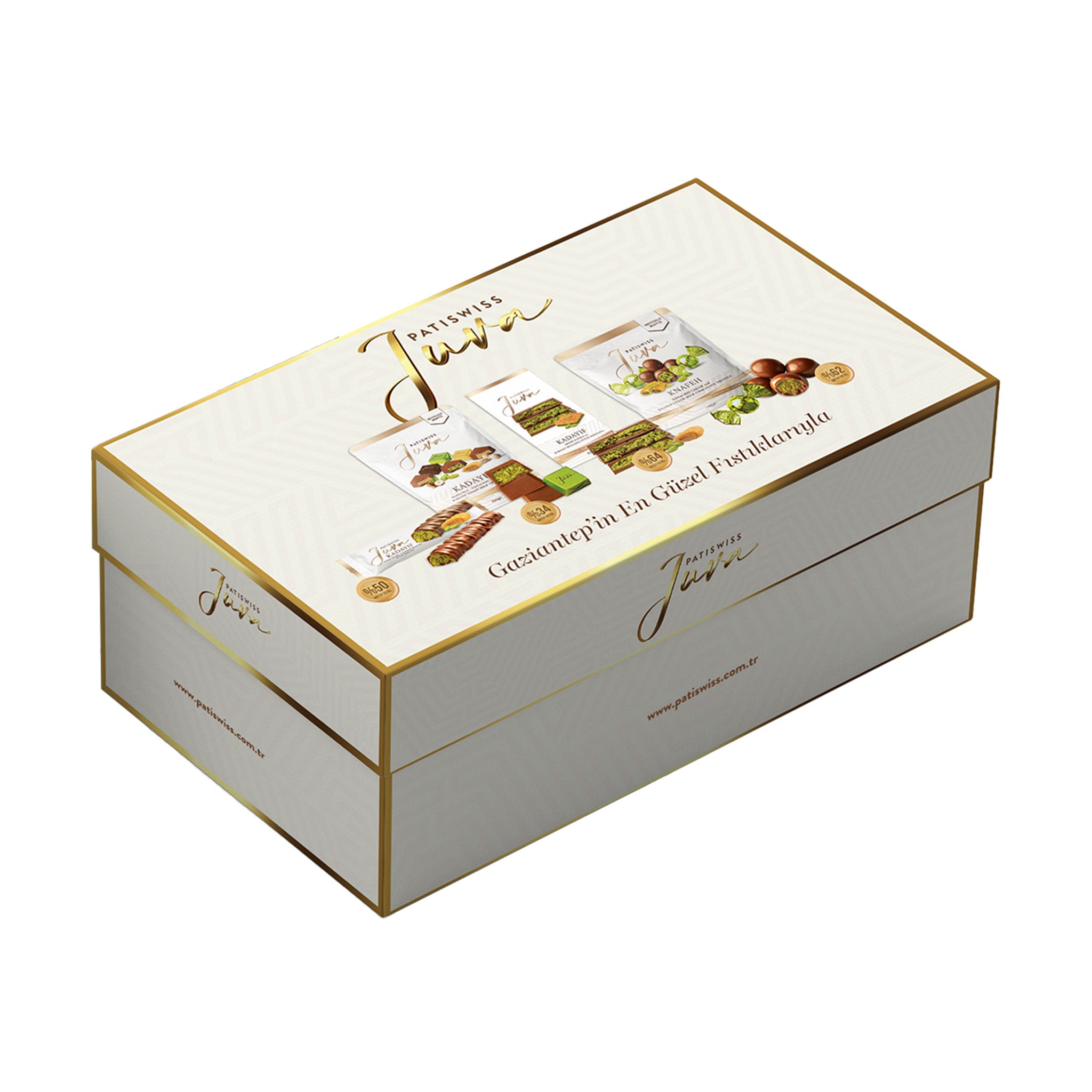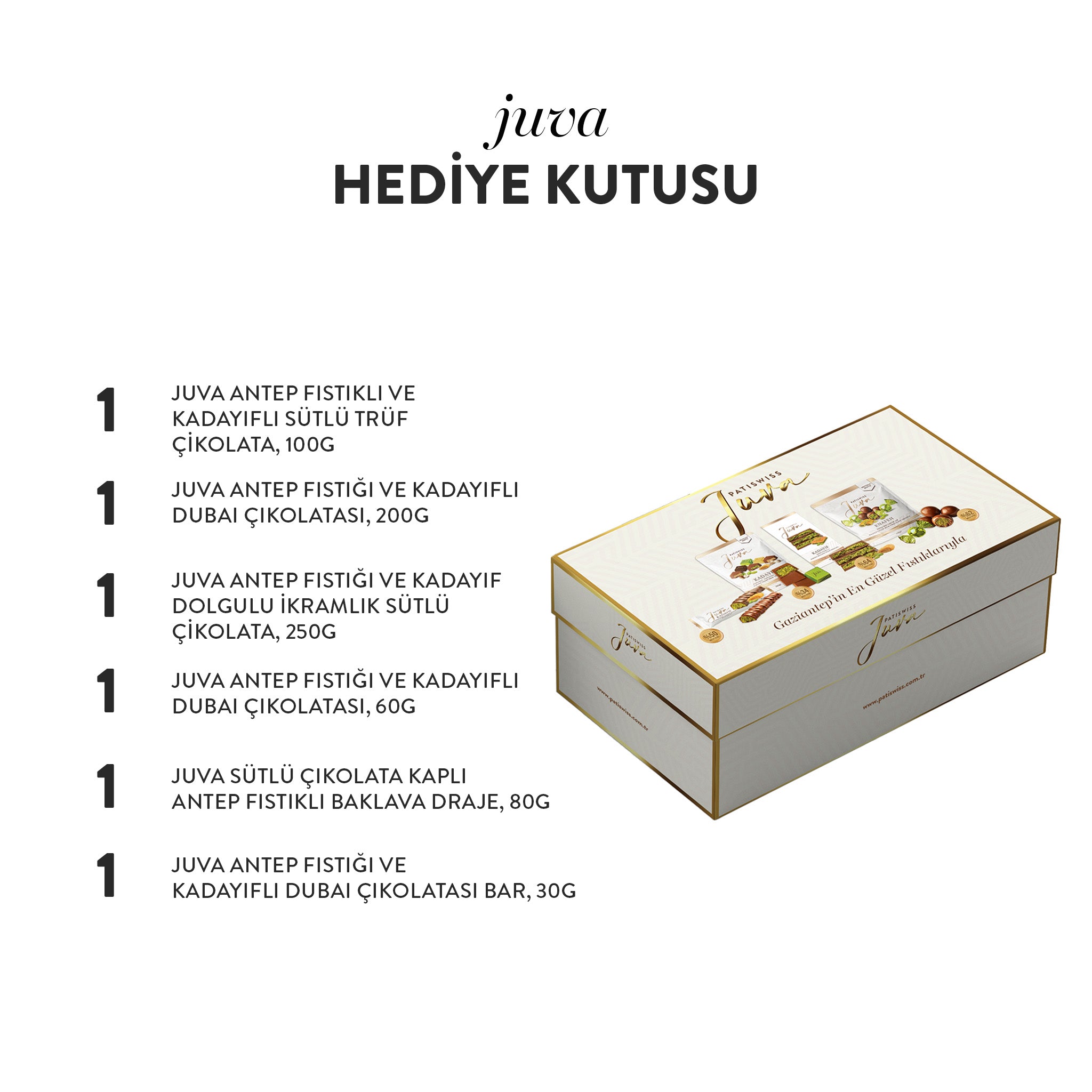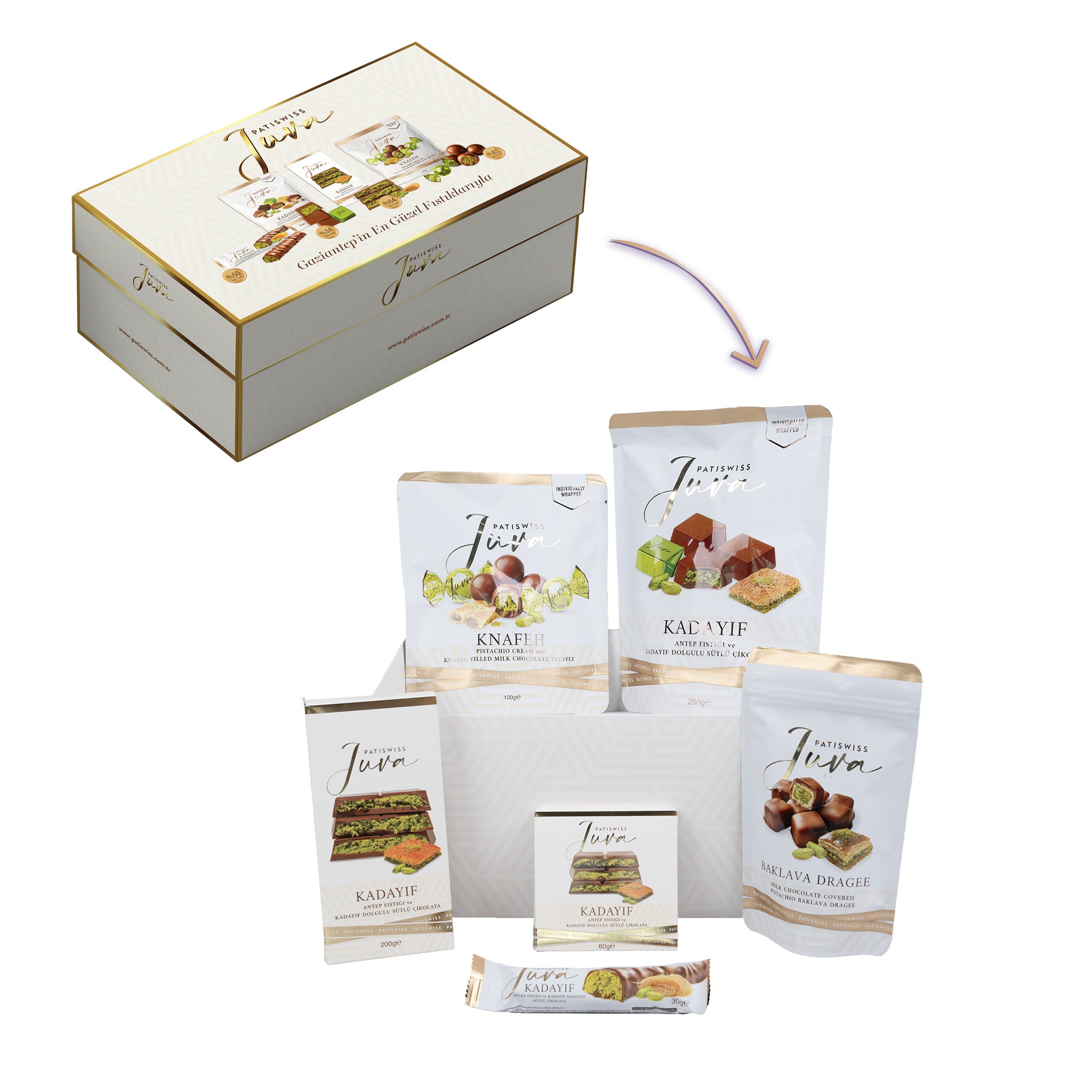 Juva Beyaz Hediye Kutusu Antep Fıstığı ve Kadayıflı Sütlü Çikolata Serisi